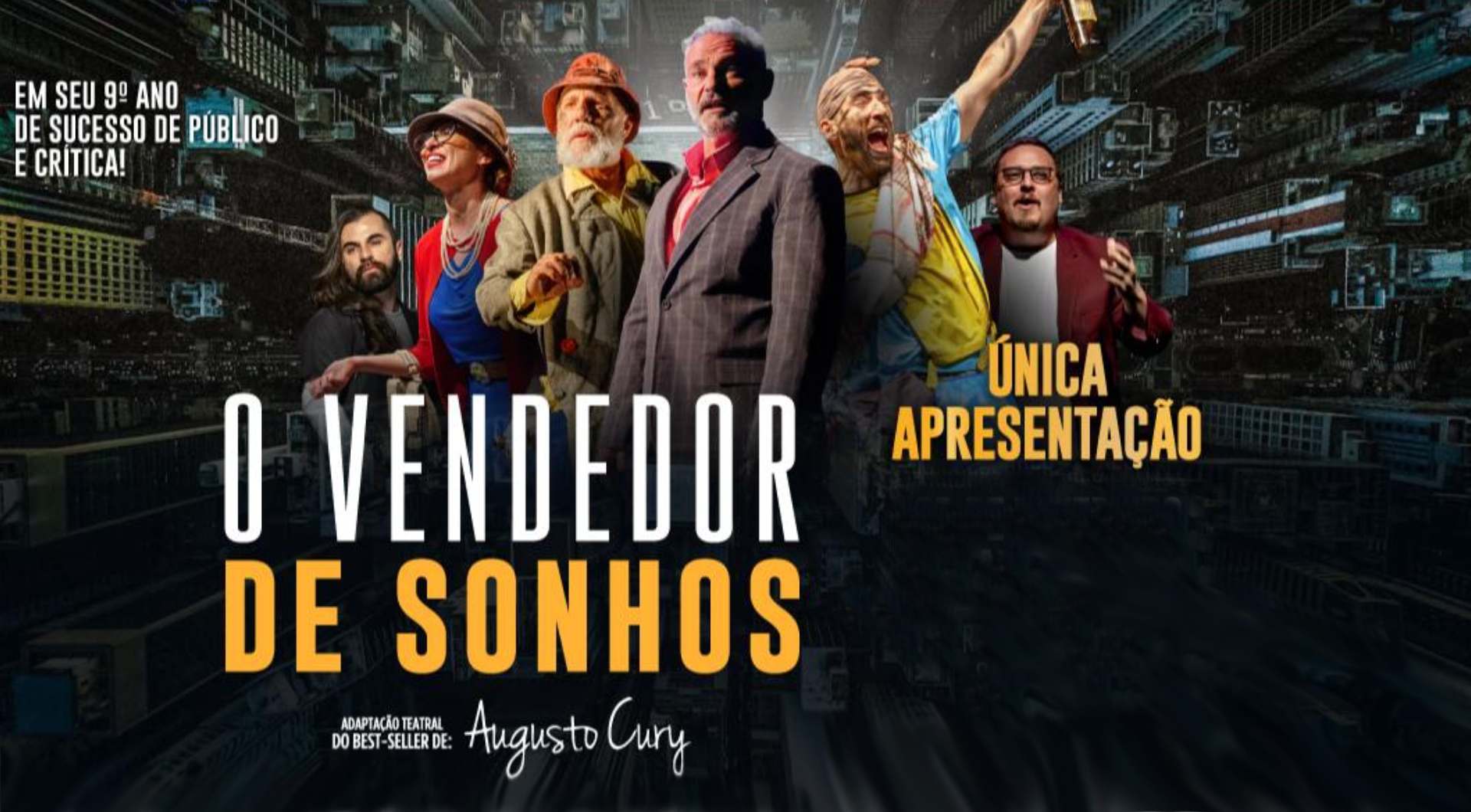 O livro O Vendedor de Sonhos já foi traduzido para mais de 60 idiomas e também virou filme – e é a primeira obra de Augusto Cury (o psiquiatra mais lido no mundo atualmente) a receber uma adaptação para o teatro. “Ver os atores interpretando no palco os personagens que eu construí nas mais diversas situações estressantes em que eles passaram, levando o espectador a fazer uma viagem para dentro de si mesmo para encontrar o mais importante endereço que poucos encontram, o endereço em sua própria mente, é de fato um grande prazer”, conta Cury.