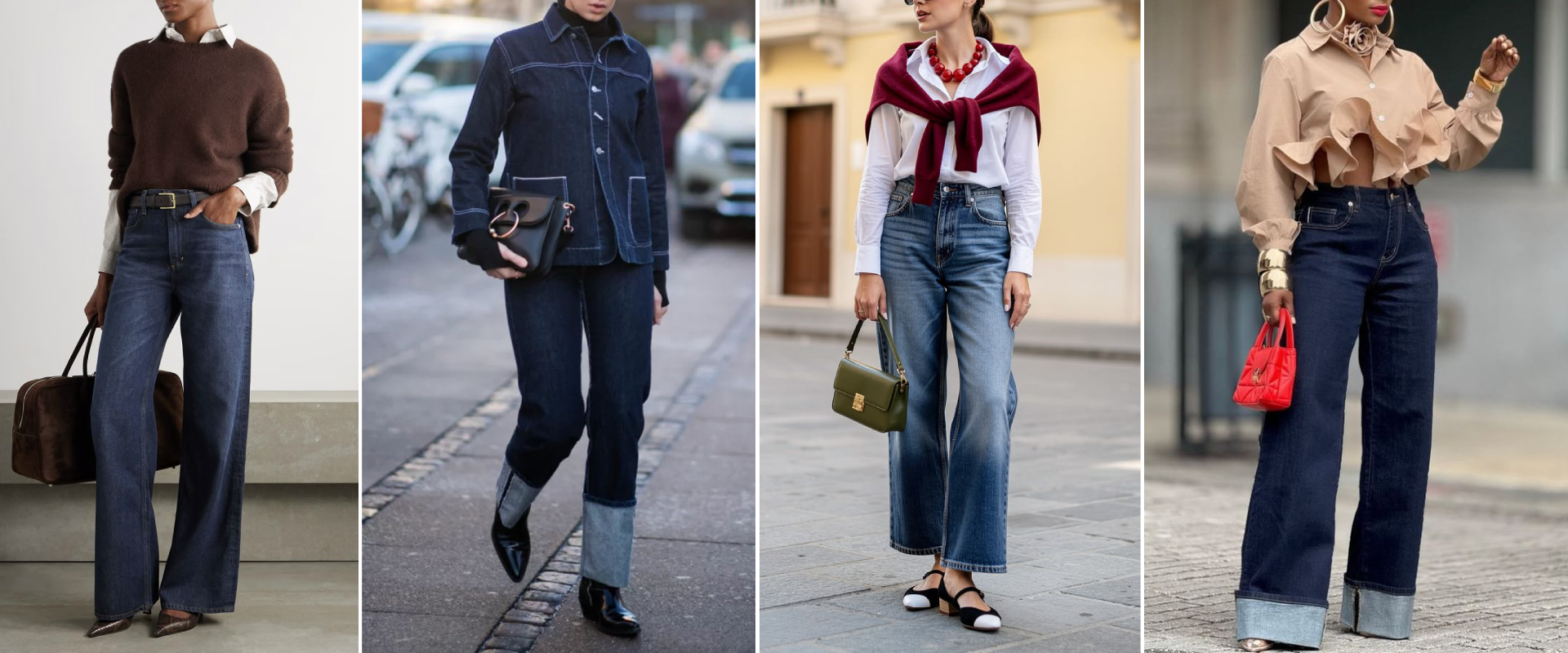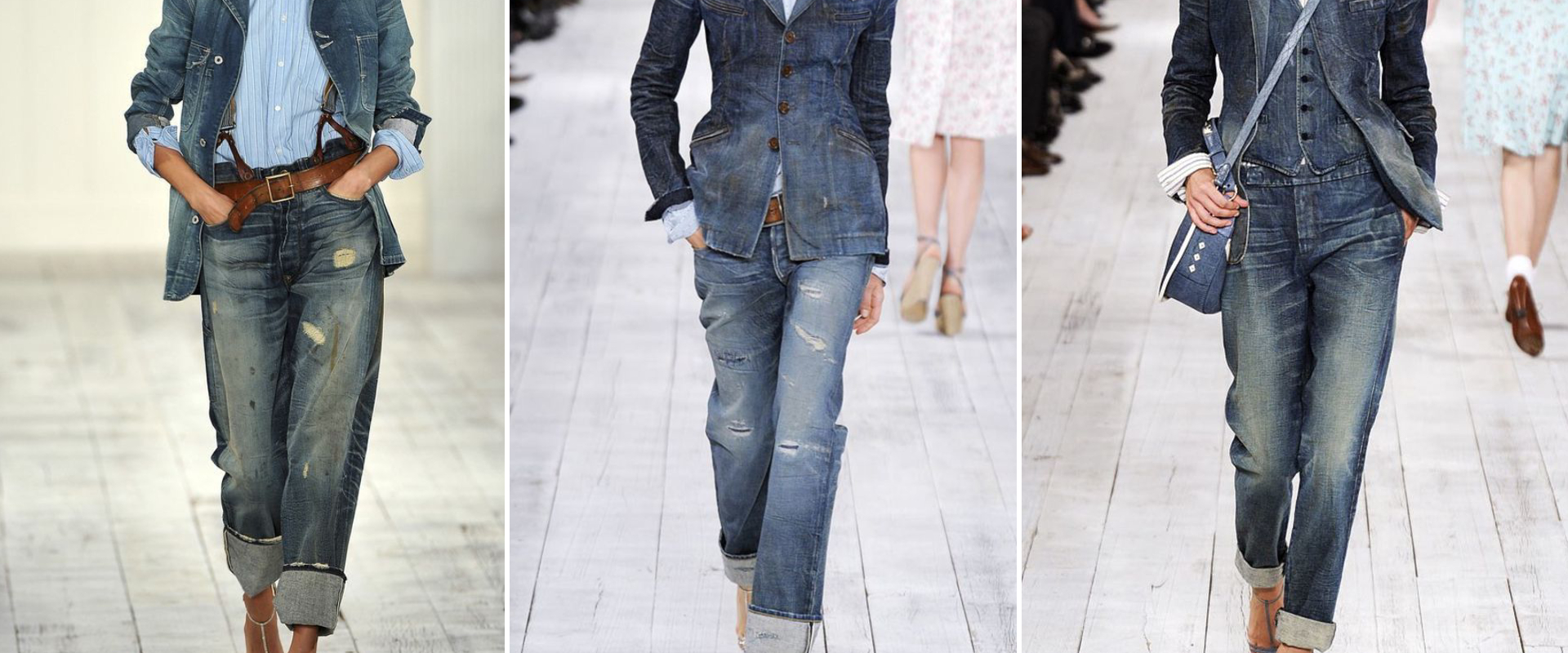 ​A influência dos anos 90 continua, mas agora com um foco em denim 100% algodão (mais rígido e pesado), que ajuda a estruturar o corpo. A barra dobrada (cuffed jeans) surge como detalhe-chave do styling, trazendo um toque casual e atual ao jeans tradicional. Mais larga e proposital, criando interesse visual e reforçando a ideia de que pequenos ajustes fazem grandes diferenças no look.