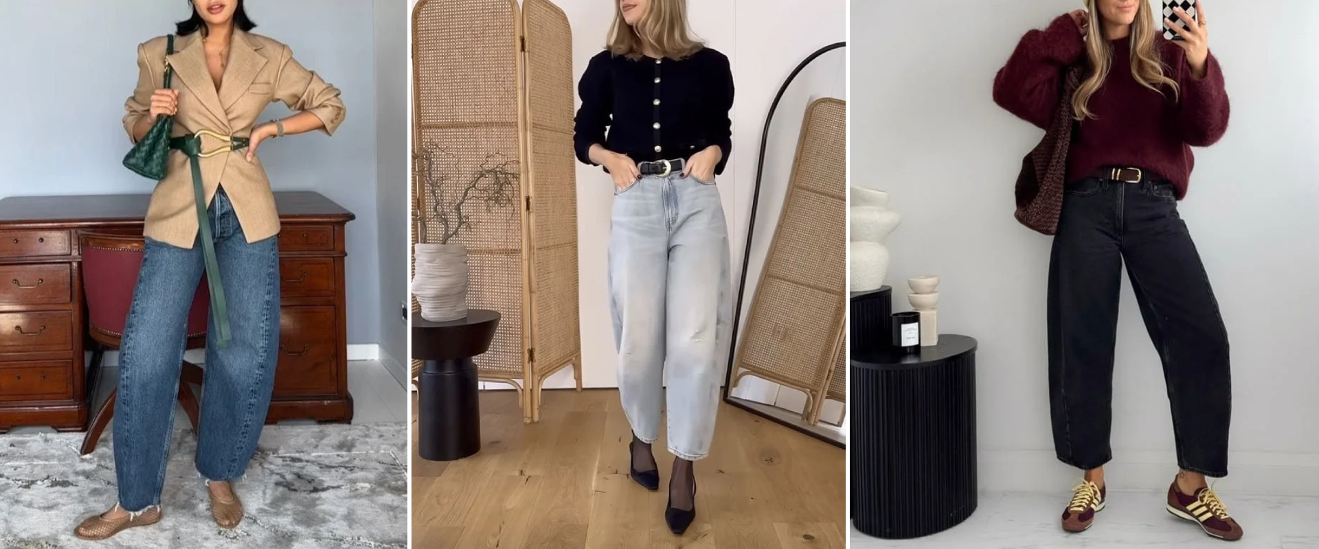Não há dúvidas de que os anos 2000 foram marcados pela silhueta skinny e que, na década seguinte, as calças com pernas amplas ganharam espaço. Agora, o modelo Barrel Leg vem despontando nas passarelas. Ela é ajustada na cintura, curva-se para fora na altura dos joelhos e volta a fechar levemente no tornozelo, criando um volume arquitetônico que tira qualquer look básico do óbvio. Use com botas de bico fino ou sapatilhas de tiras para contrastar com o volume da perna.