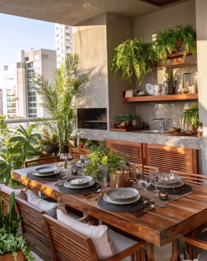 A varanda gourmet costuma ter revestimentos mais frios, como pedras, inox e marcenaria planejada. As plantas entram para quebrar essa rigidez. Os jardins verticais são a solução perfeita para otimizar espaço. Painéis de madeira ou treliças com samambaias e jiboias criam uma “parede viva” que serve de fundo para a mesa de jantar. O vasos de chão grandes com espécies como a Figueira-lira (Ficus lyrata) ou a Pleomele dão volume e preenchem cantos vazios, trazendo uma sensação de jardim de inverno.