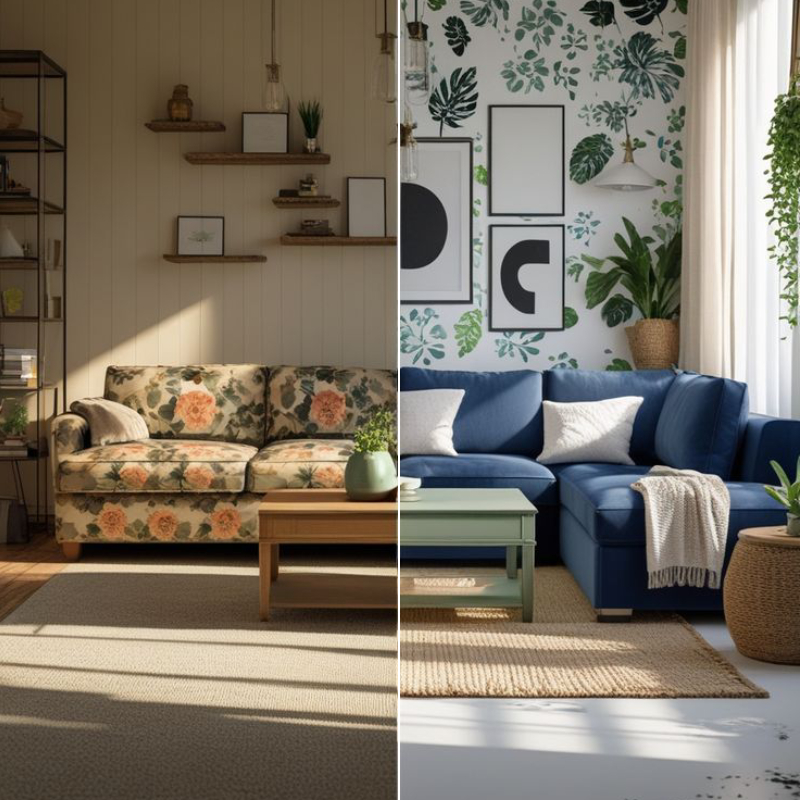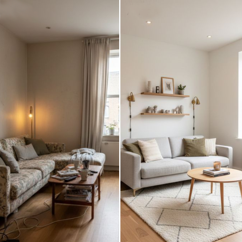 * Outro truque barato na decoração é simplesmente mudar a disposição dos móveis, já que muitos ambientes parecem cansados apenas porque o layout permanece igual por anos. Ao girar o sofá, aproximar poltronas, afastar a mesa da parede ou criar um novo ponto focal, o cômodo ganha dinâmica nova sem nenhum custo.