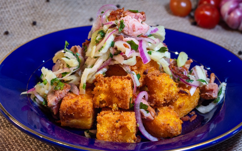 Rumo ao Hexa: Bolinho de batata-doce e batata asterix com escarola, muçarela e bacon.