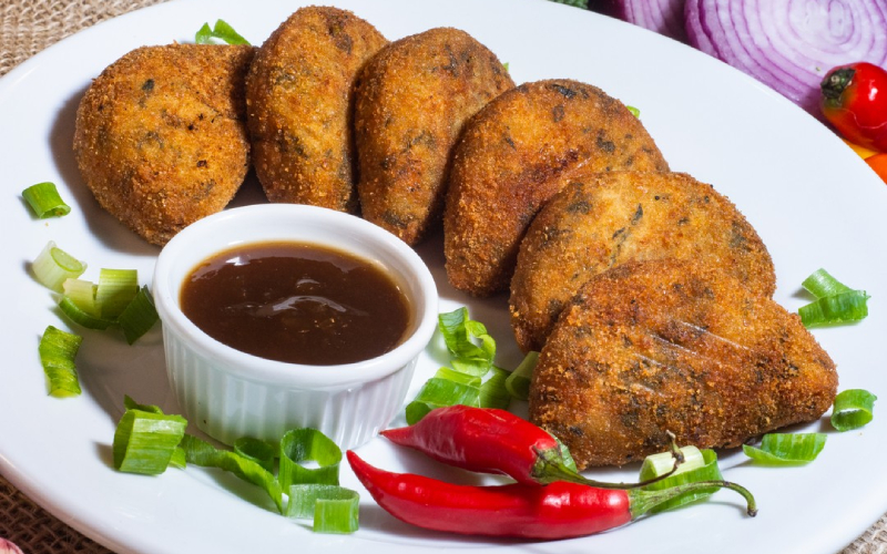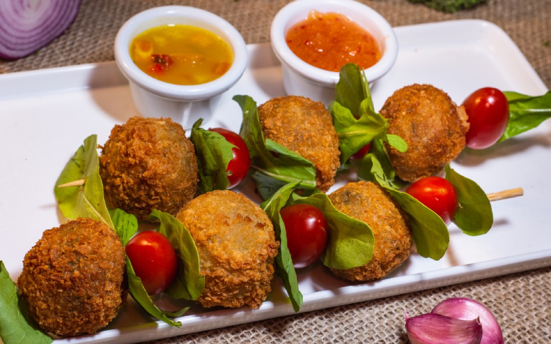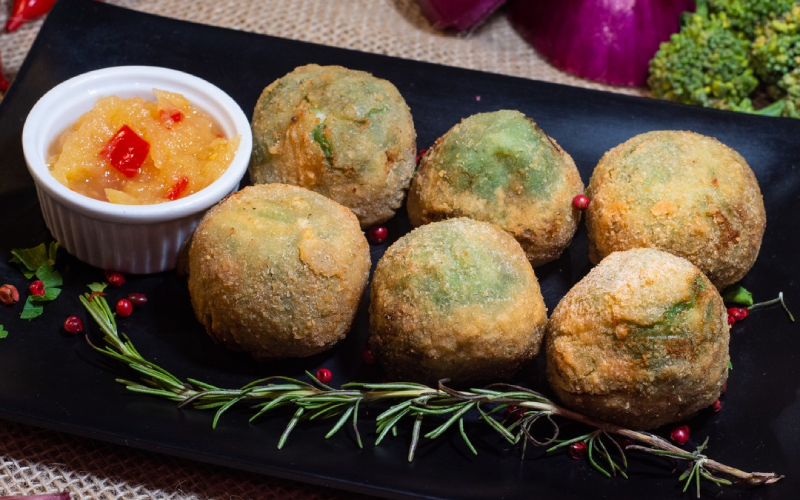 Broconzola: Bolinho de brócolis com gorgonzola e catupiry, empanado e servido com geleia tropical de maracujá, abacaxi e laranja.