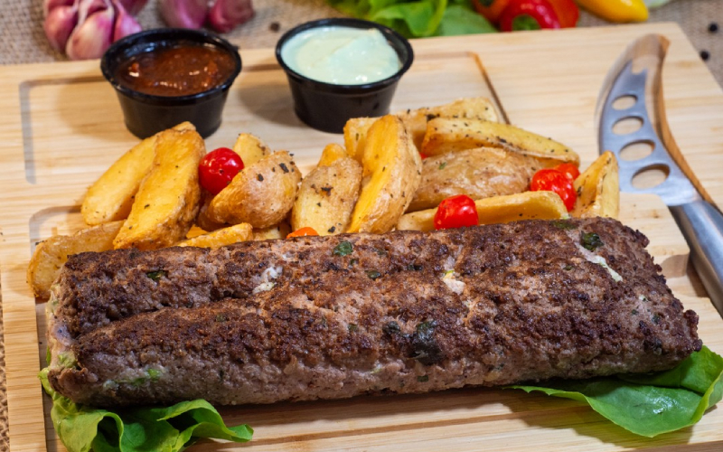 Kafta recheada de escarola: Kafta recheada de escarola, catupiry e bacon. Acompanha batata rústica, molho barbecue e maionese verde.