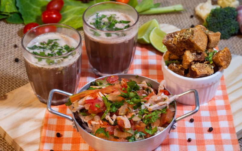 Quem não gosta de “Porco” bom sujeito não é: Lascas de pernil, molho rústico de tomate com alho-poró. Caldinho de feijão preto e torresminho com ervas finas.