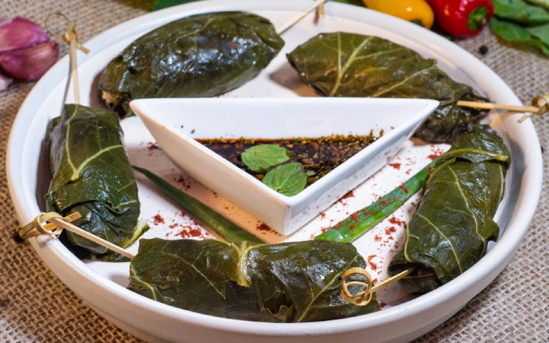 Abraço de Pernil: Pernil desfiado, temperado e cozido com cebola picada, tomate picado, arroz, alho, enrolado com couve-manteiga, regado molho ao sugo. Acompanhado de molho.