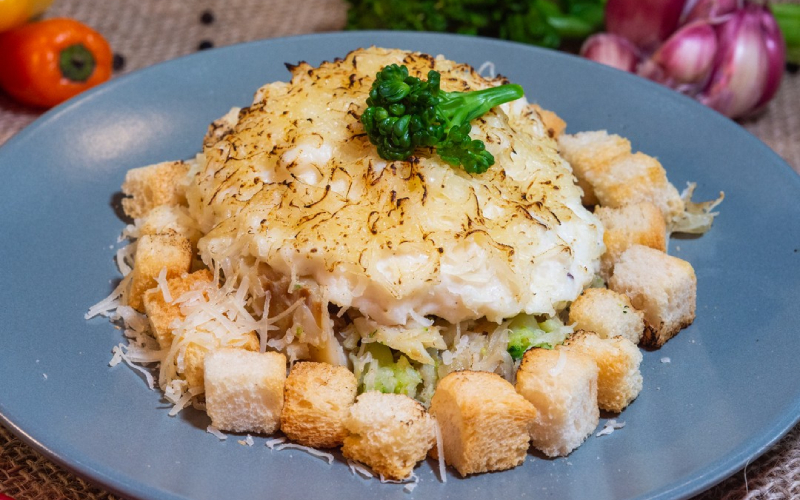 Bacalhau Afogado: Lascas de bacalhau preparadas com brócolis levemente al dente, finalizadas com molho de queijo, croûtons crocantes e camada de parmesão gratinado.