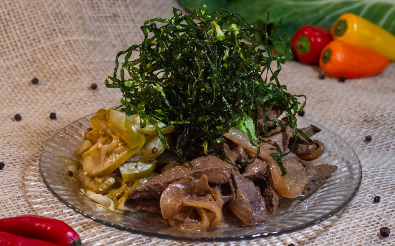 Fígado, Fígado, Fíííííííígado… Fígado marinado por 48h, feito acebolado com picles de jiló levemente adocicado e crocante de couve.