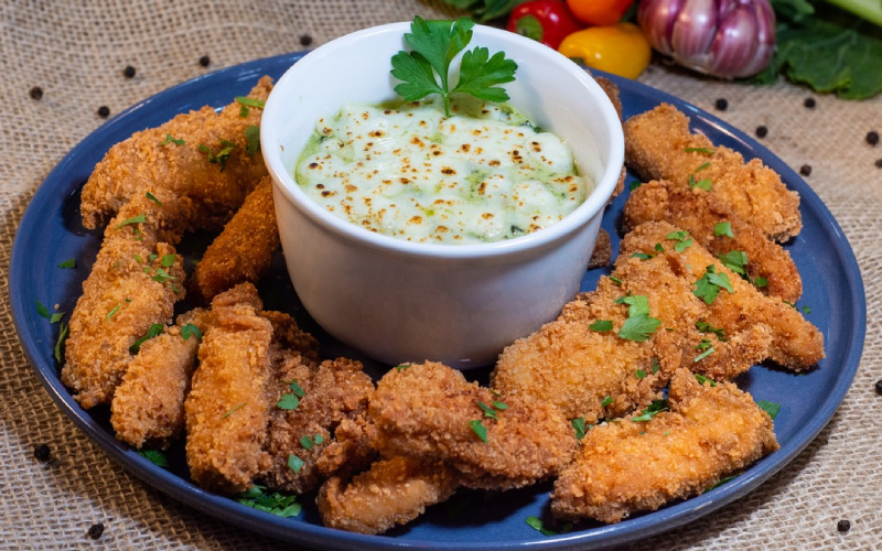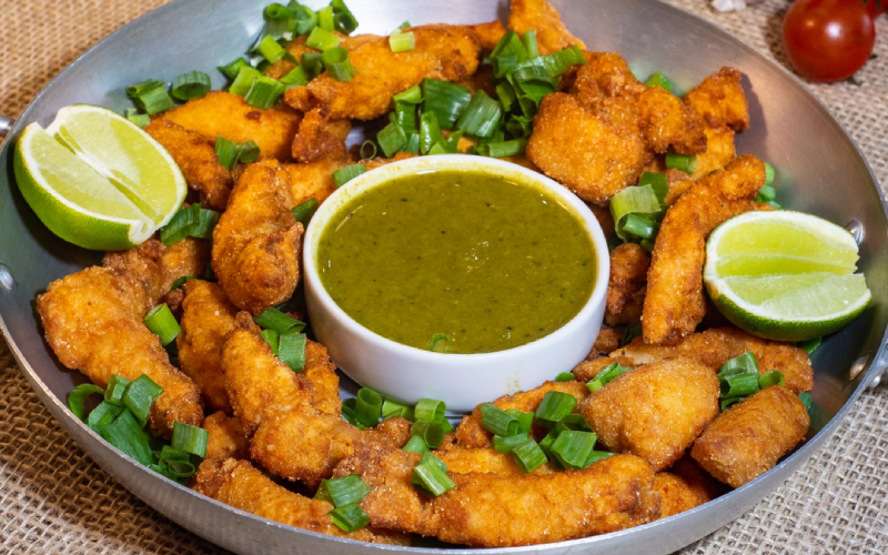 Tilápia com molho verde amazônica: Iscas de tilápia com molho de jambu e tucupi.